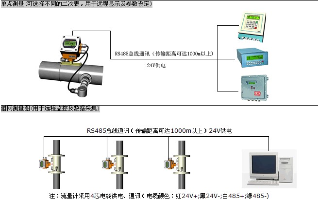 一次表與二次表(或計(jì)算機(jī))之間采用RS-485總線通訊,采用普通電纜即可,傳輸距離可達(dá)1000米以上,組網(wǎng)十分方便、快捷。這種傳輸方式抗干擾能力強(qiáng),解決了分體式超聲波流量計(jì)專用電纜成本高、抗干擾能力差、傳輸距離短等問題。