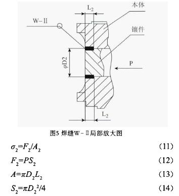 如圖5所示,p為設計壓強,設焊縫w-II的熔深為L2,焊接部外徑為D2,則其焊接部工作應力σ2計算方法如下